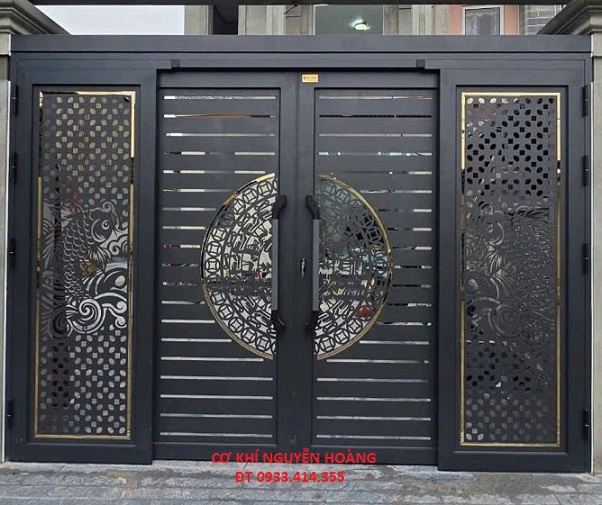 - Cửa cổng sắt có thể được trang trí bằng các bông gang có sẵn như hình rồng phượng, hoa, chim cảnh… tạo nên phong cách đẳng cấp. Nhiều mẫu cửa đơn giản chỉ là những thanh song đứng dọc đính khuy, khung bao sắt kết hợp tôn khoan lỗ, tôn lưới, cửa lưới rào, cửa cổng sắt hộp,…